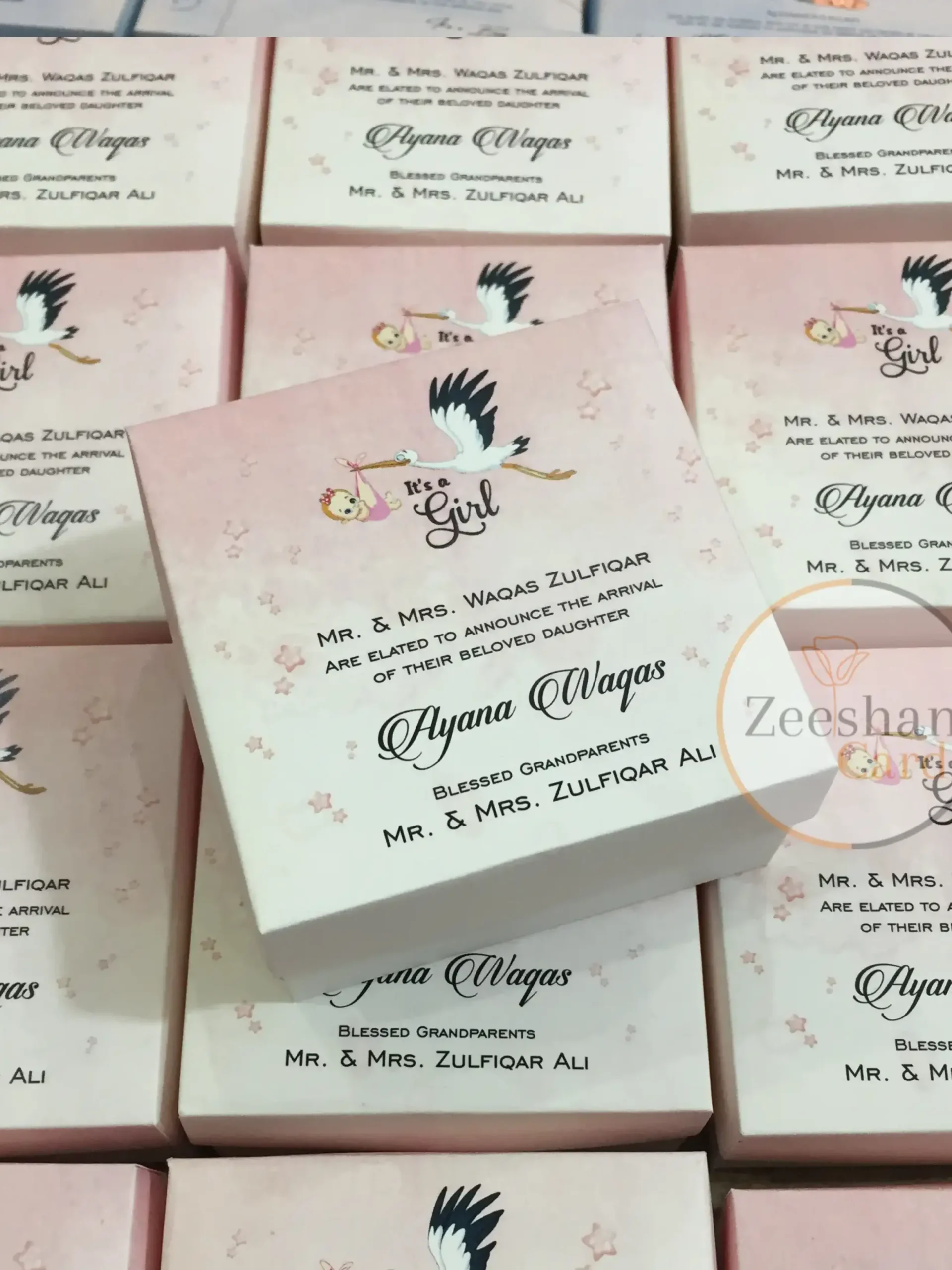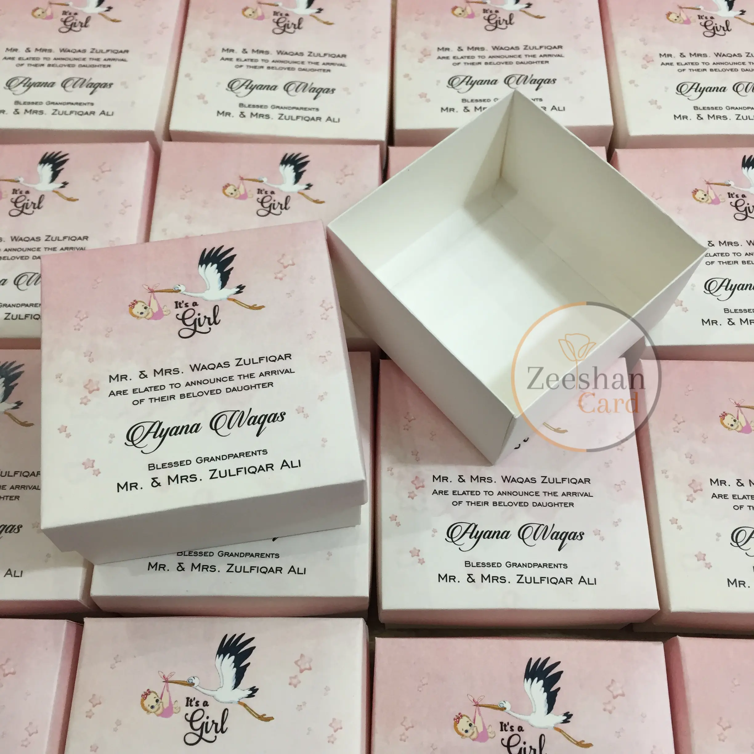All your wedding needs including Two Piece Card Board Baby Girl Box , Bid box, sweet, favor, Tin, Baby announcement boxes and more…