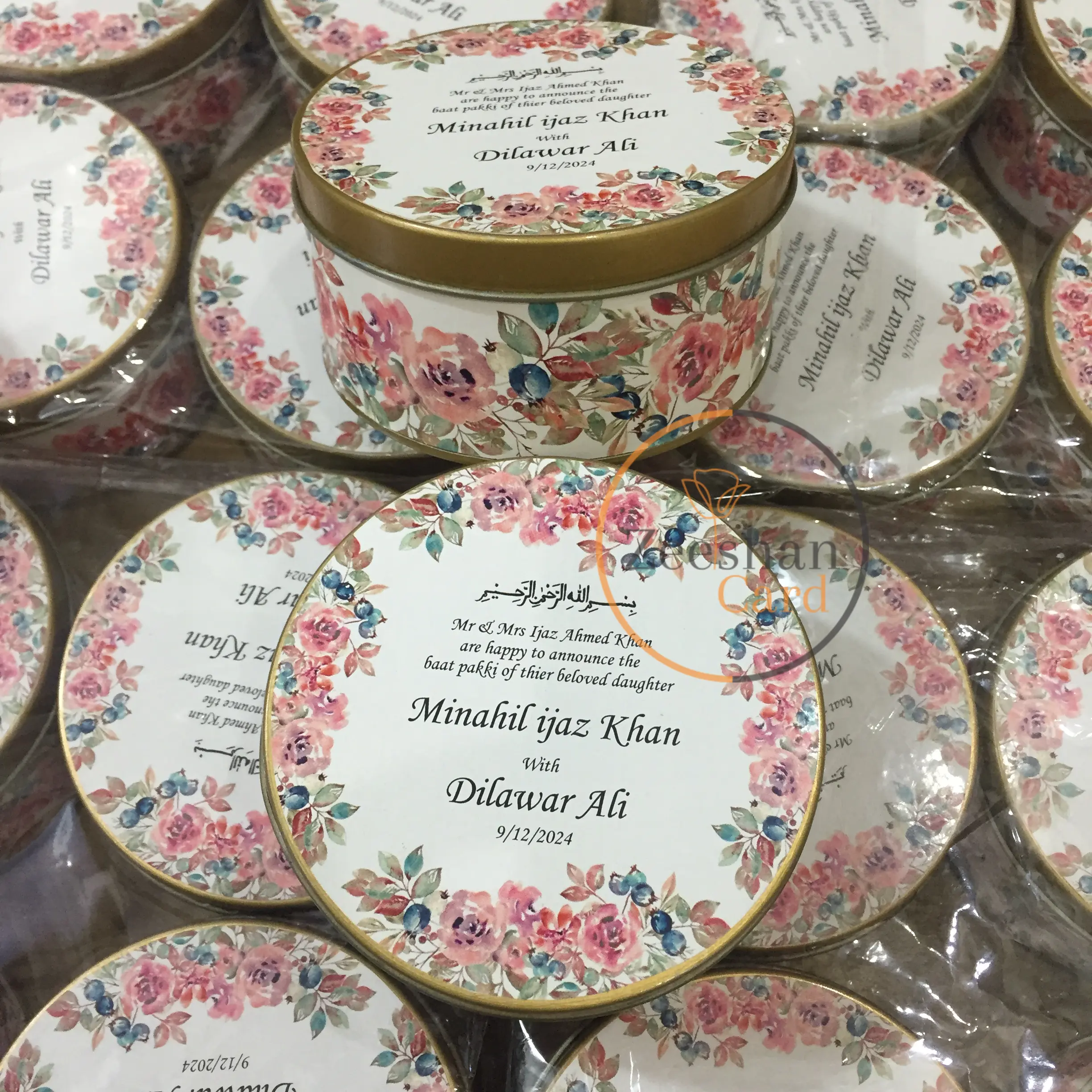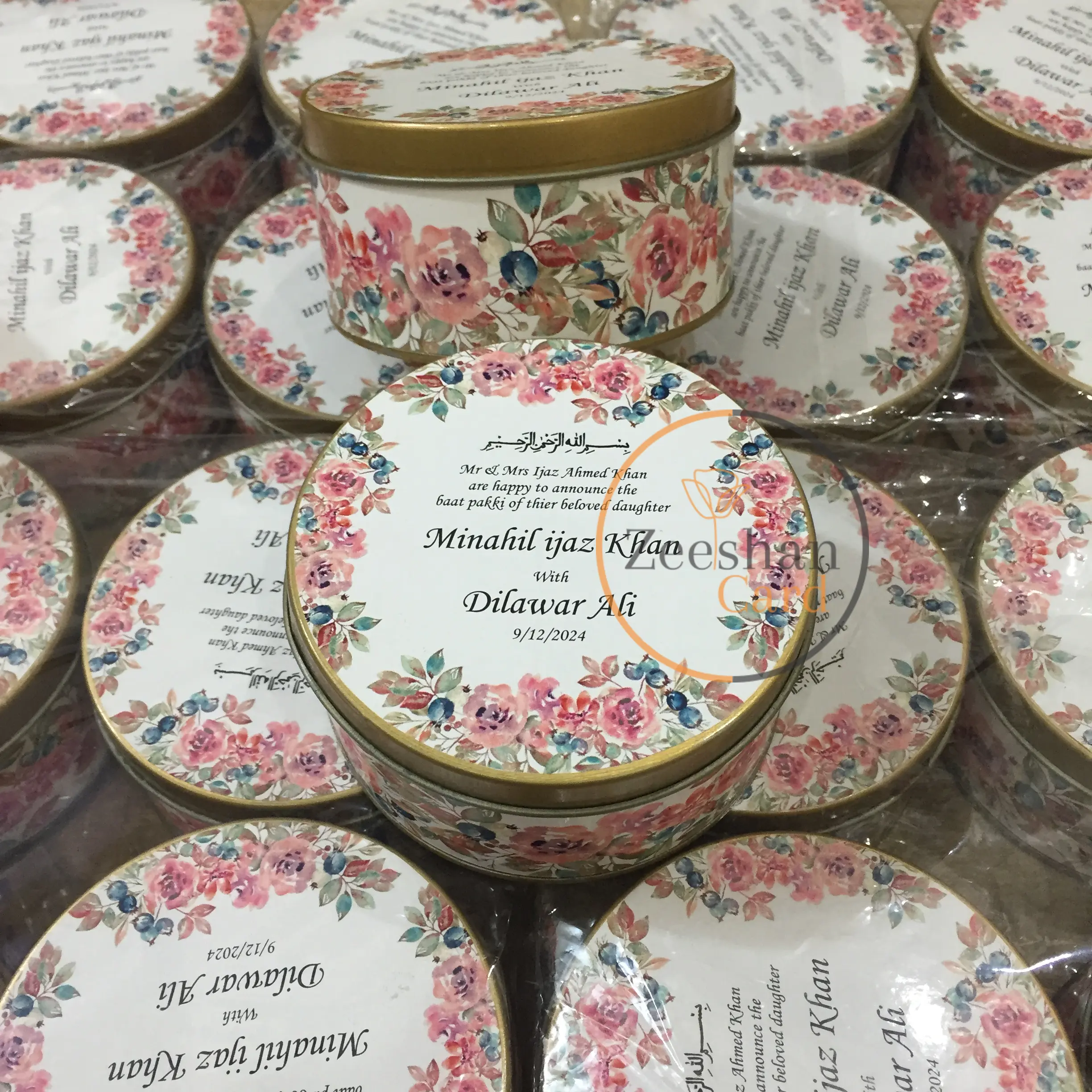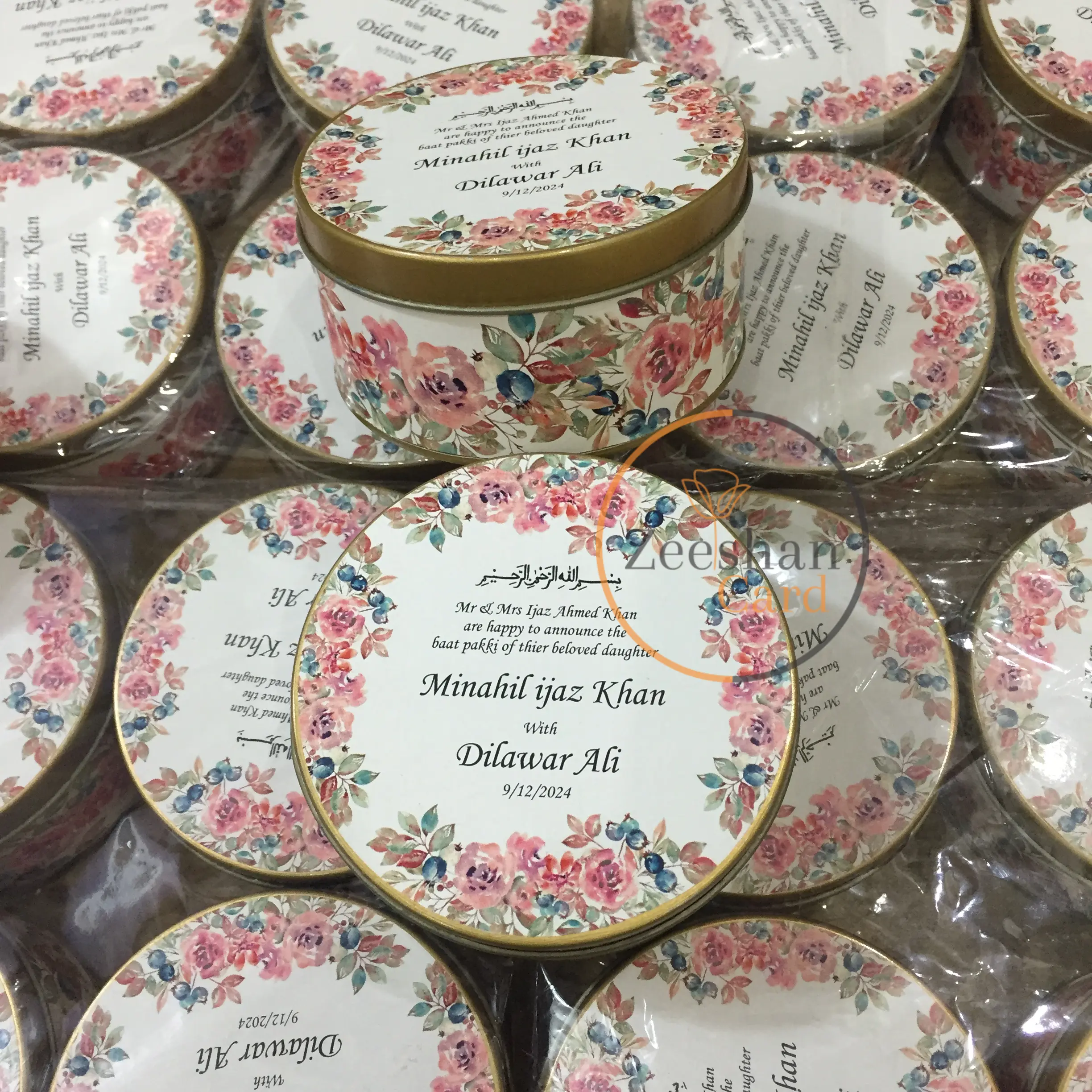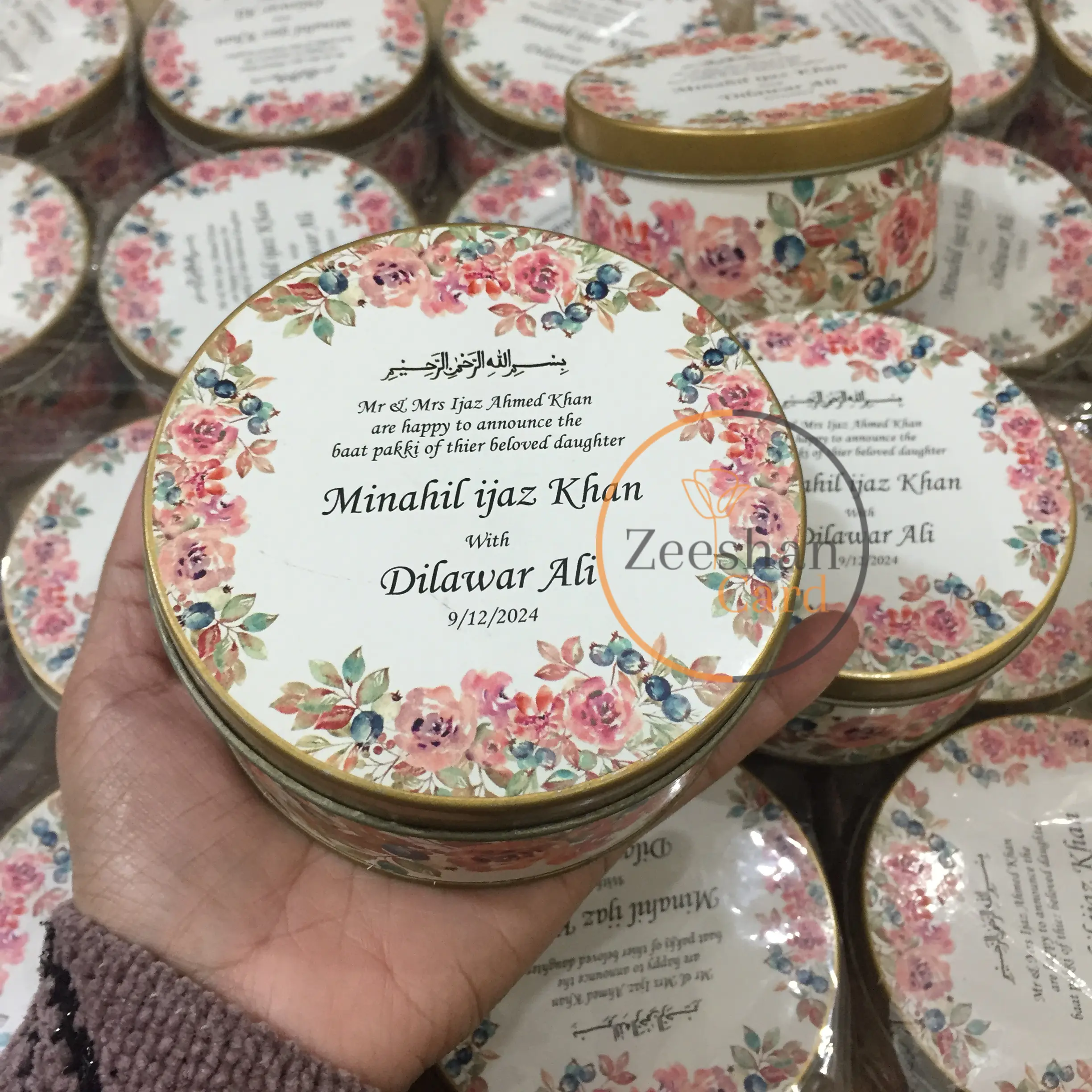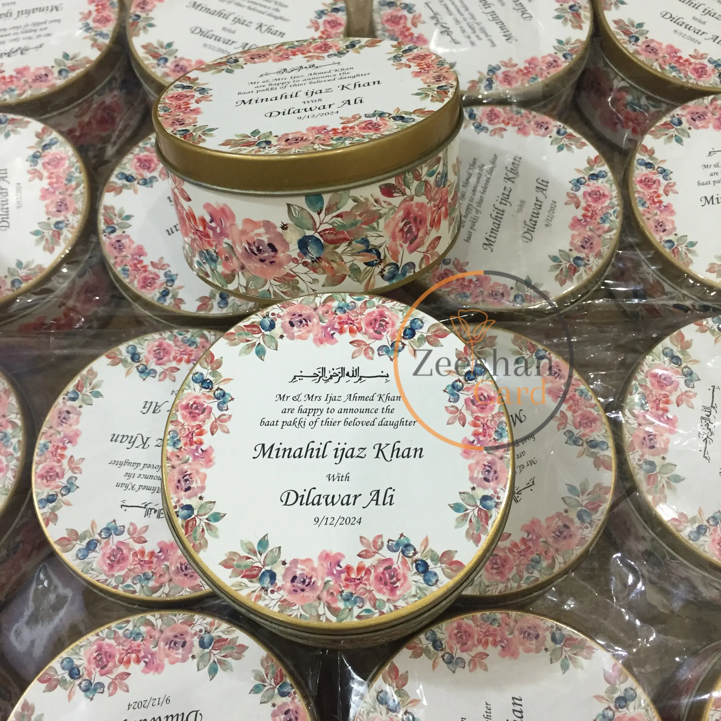All your wedding needs including Pink Flower Tin Box , favor, Tin, Baby announcement boxes and more…
